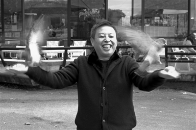 熔盛重工路演期間,張志熔喂食鴿子。鄧輝 攝
