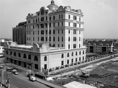 張志熔的老宅,原本是一座始建于上世紀80年代的三層青色樓房。春節前后,另一棟樓房,按其標準被克隆而出。長約30米的廊亭,串聯起老宅與院北高約10層的金頂歐式高樓。