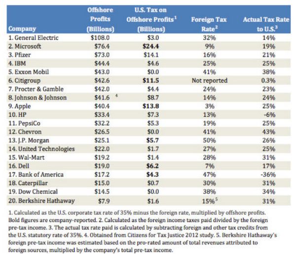 大多數的公司都并沒有提供如果它們將利潤遣返回國將會要負責承擔多少稅款估算。據該網站指出,前十家公司占有著68%的離岸利潤。一些高科技公司–微軟公司(Microsoft)、蘋果公司(Apple)和戴爾公司(Dell)–將其實際的外國稅率保持在低于10%的水平。
