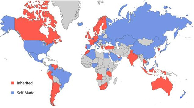 法國經濟學家Raul Amoros對不同國家首富的資金來源做了個統計,發現“拼爹”當上的首富跟“拼才華”白手起家的首富比基本是1:1。他把統計結果發到了網站上。這張圖中紅色區域代表首富財產來自繼承家族遺產,藍色代表這個地區有一位白手起家的首富。總的來說,52%的首富是含著金鑰匙出生,剩下的就得“拼才華”了。