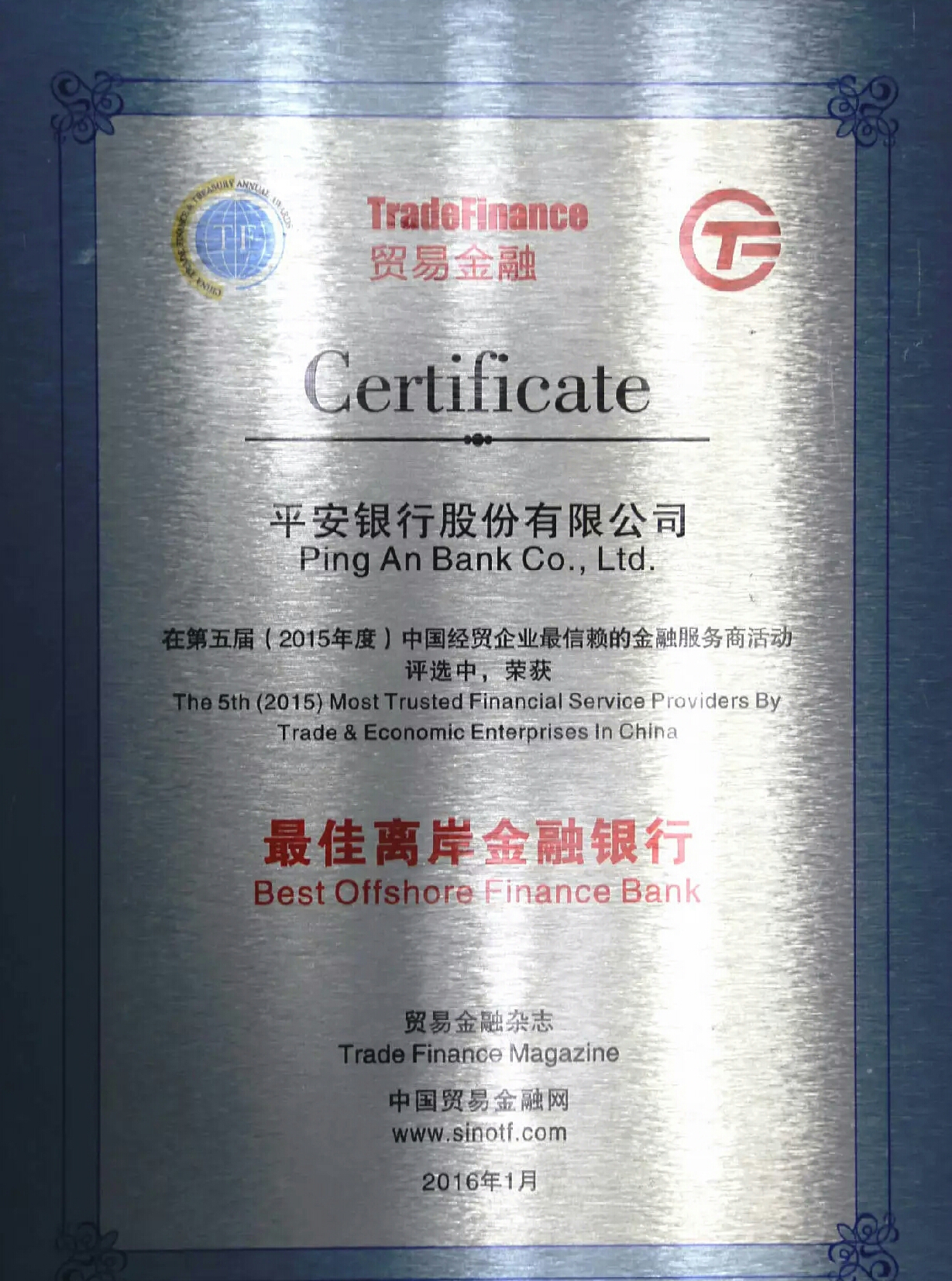 新年伊始,捷報(bào)頻傳。平安銀行憑借在離岸金融領(lǐng)域的優(yōu)異表現(xiàn),在不久前落下帷幕的《首席財(cái)務(wù)官》雜志舉辦的“第九屆中國(guó)CFO年會(huì)”和《貿(mào)易金融》雜志、中國(guó)貿(mào)易金融網(wǎng)聯(lián)合主辦的“第五屆中國(guó)經(jīng)貿(mào)企業(yè)最信賴的金融服務(wù)商評(píng)選”活動(dòng)中,先后斬獲2015年度“最佳離岸業(yè)務(wù)獎(jiǎng)”和“最佳離岸金融銀行”榮譽(yù)。這是平安銀行連續(xù)四年榮獲該兩項(xiàng)“最佳離岸銀行”獎(jiǎng)項(xiàng)。