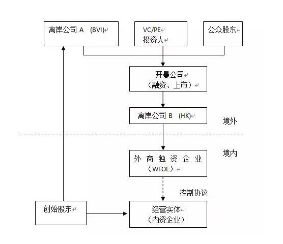 1.企業(指內資經營實體)的創始股東在境外設立一個離岸公司A,比如在英屬維爾京群島(BVI)或是開曼群島。