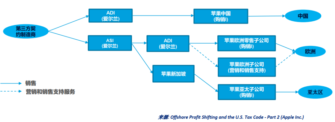 以蘋果公司歷史上進行的稅收籌劃為例,蘋果的愛爾蘭關聯方(“ASI”)負責將產品銷售到歐洲、中東、非洲、印度和亞太區。Apple Inc.(美國)擁有與蘋果產品有關的無形資產在美國的經濟所有權,而通過成本分攤協議由愛爾蘭關聯方ASI 及其母公司Apple Operations Europe Inc. (“AOE”) 擁有無形資產在美國以外地區的經濟所有權。具體如下: