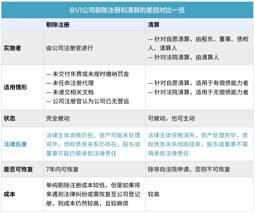 ? 由此可見,在解散一家BVI公司時,需要慎重考慮選擇“剔除注冊”還是“清算”,二者法律責任不同,法律風險更是迥異。相對而言,剔除注冊的法律風險更高。