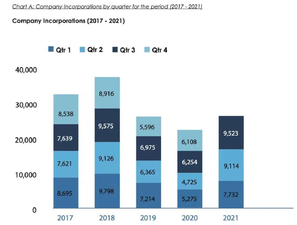 根據BVI公布的第三季度統計數據,2021年前三季度的公司注冊數量為9523家,同比2020年第三季度的6254家增幅高達近35%;即便與今年第二季度的9114家相比,仍然保持了4.49%的增長態勢。