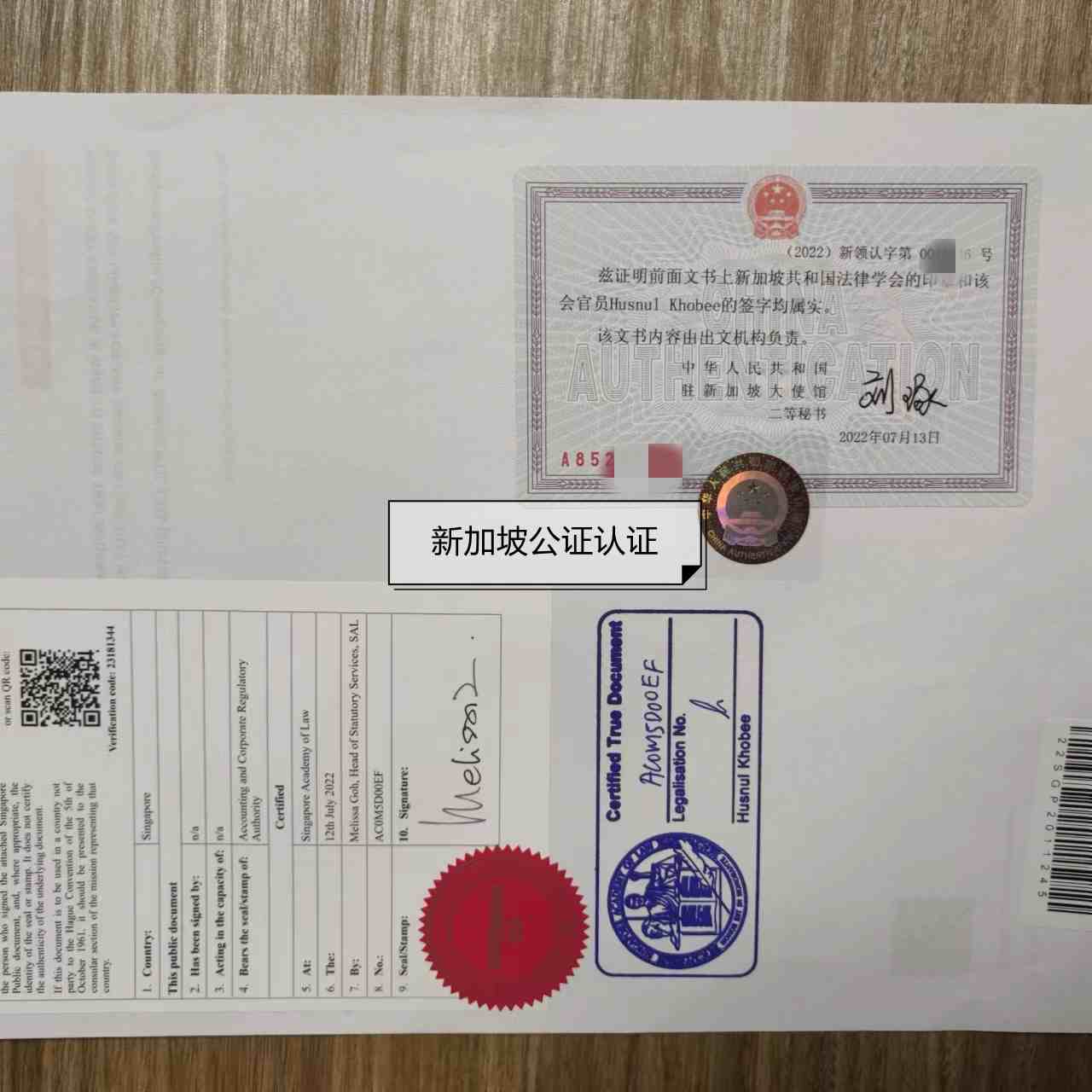 新加坡公證即由新加坡公證人對新加坡公司文件內容加以確認,新加坡公證以公證書的形式體現,由公證人對文件審核后,將公證書和所附文件捆綁為一體,并在公證書上簽章。然后將做好的公證文件送新加坡法律學會認證,最后由中國駐新加坡使館認證。