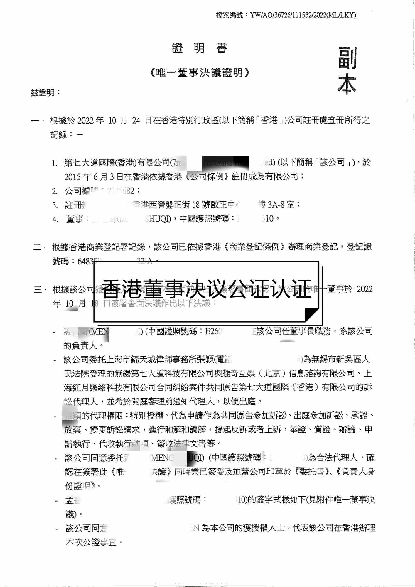 3、公司董事會決議或董事會決議摘錄確認本或復印本(簽署委托書的授權代表身份證明)。