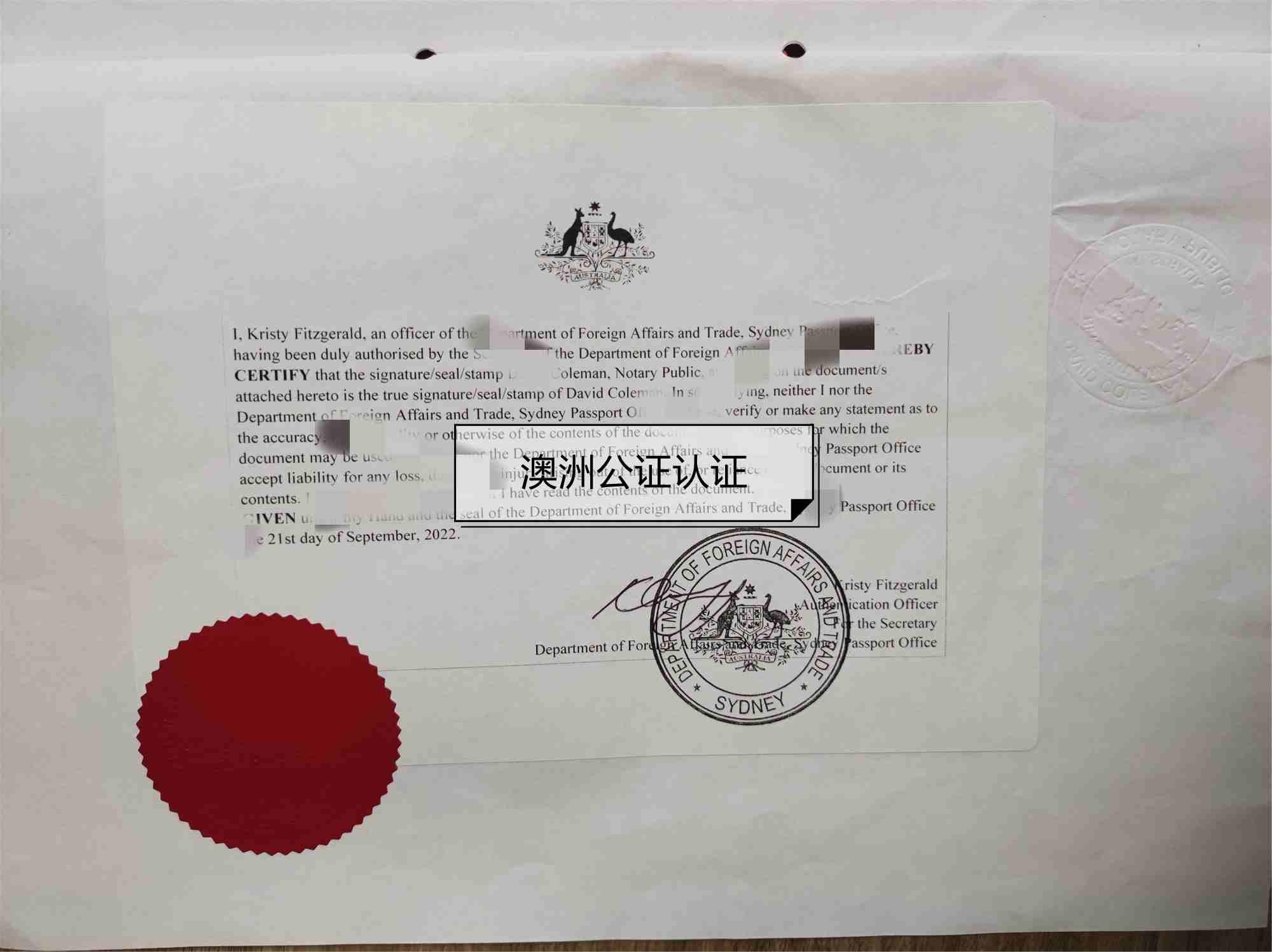 第二是澳洲為外交部對公司文件上公證律師的簽字或蓋章進行核查,確認無誤之后,并再次在文件上蓋章簽字