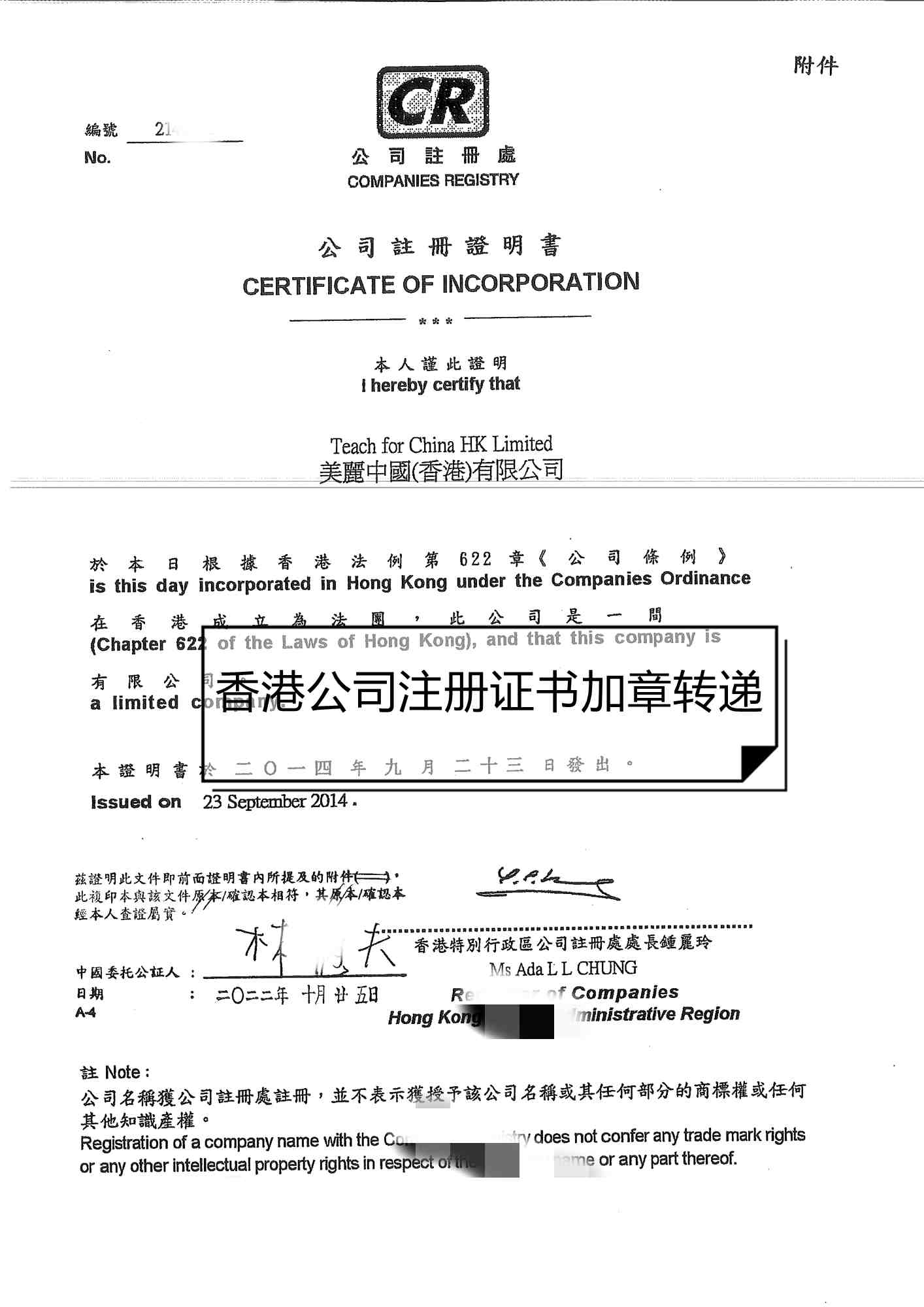 送往中國(guó)法律服務(wù)(香港)有限公司加蓋轉(zhuǎn)遞章