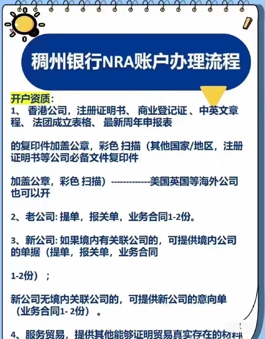 香港公司開戶需要以下資料: 1、香港公司資料 2、身份證及通行證 3、地址證明(3個月內紀錄) 4、業(yè)務證明(2-3份, 業(yè)務合同及發(fā)票或報關單) 5、內地公司營業(yè)執(zhí)照(一年以上) 6、國內公司流水, 董事個人流水單(6個月流水+蓋章,平均結余達10萬以上) 答