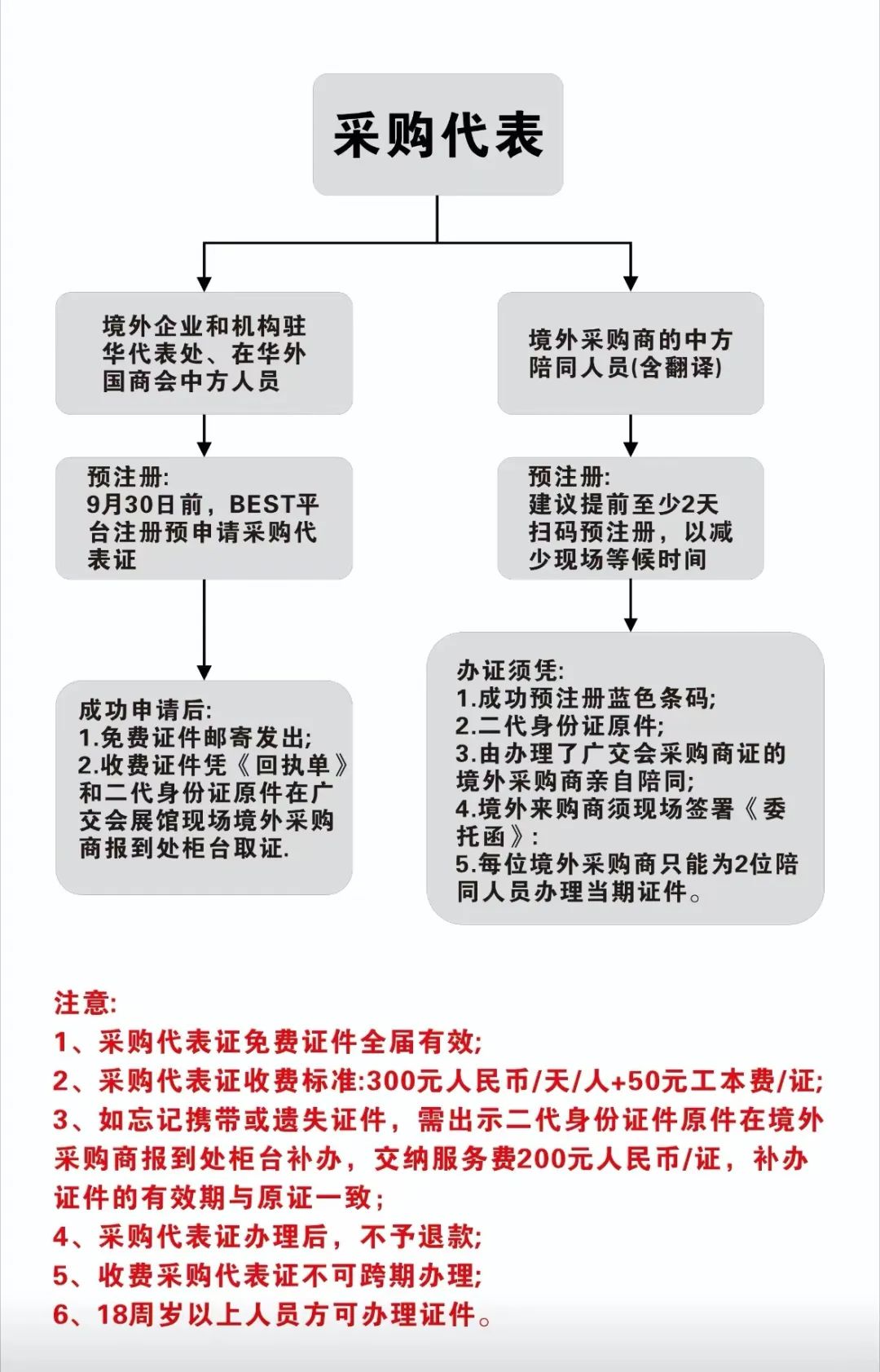 在廣交會采購商電子服務(wù)平臺(廣交會境外采購商和采購代表預(yù)注冊平臺)預(yù)注冊,申請采購代表證件。申請日期為2023年9月1日-30日。