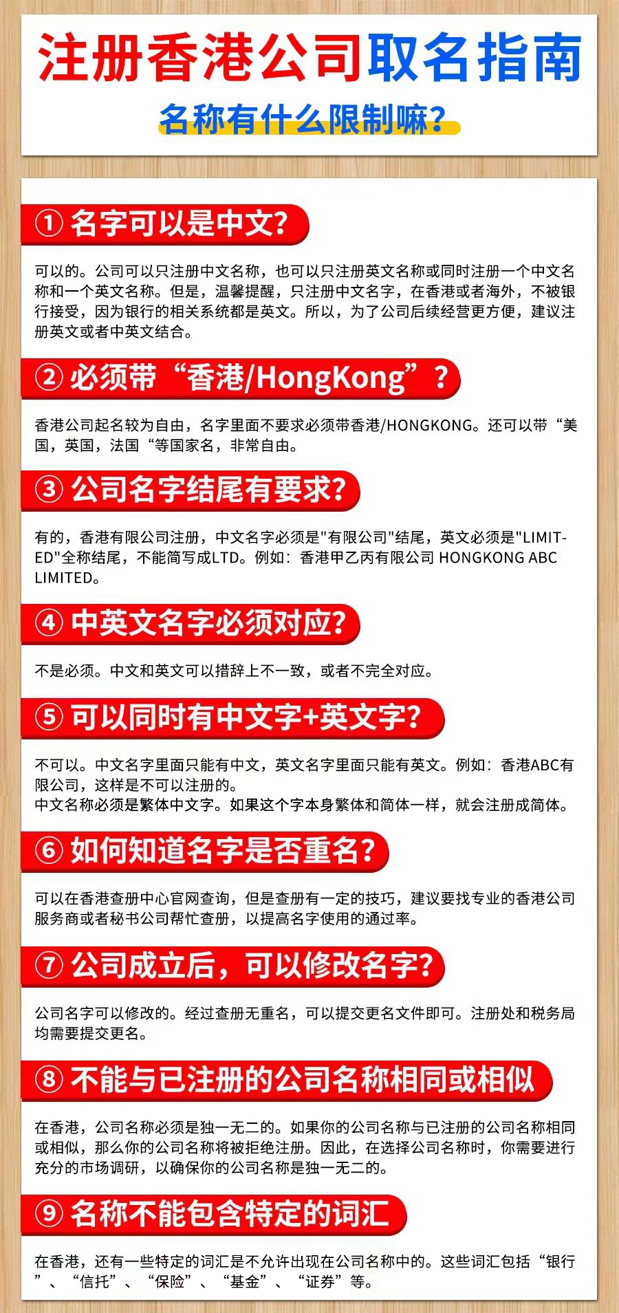 因為目前相關有關銀行開戶要求有變動,注冊香港公司時公司名稱有些關鍵詞慎重使用,否則會導致開戶不成功。