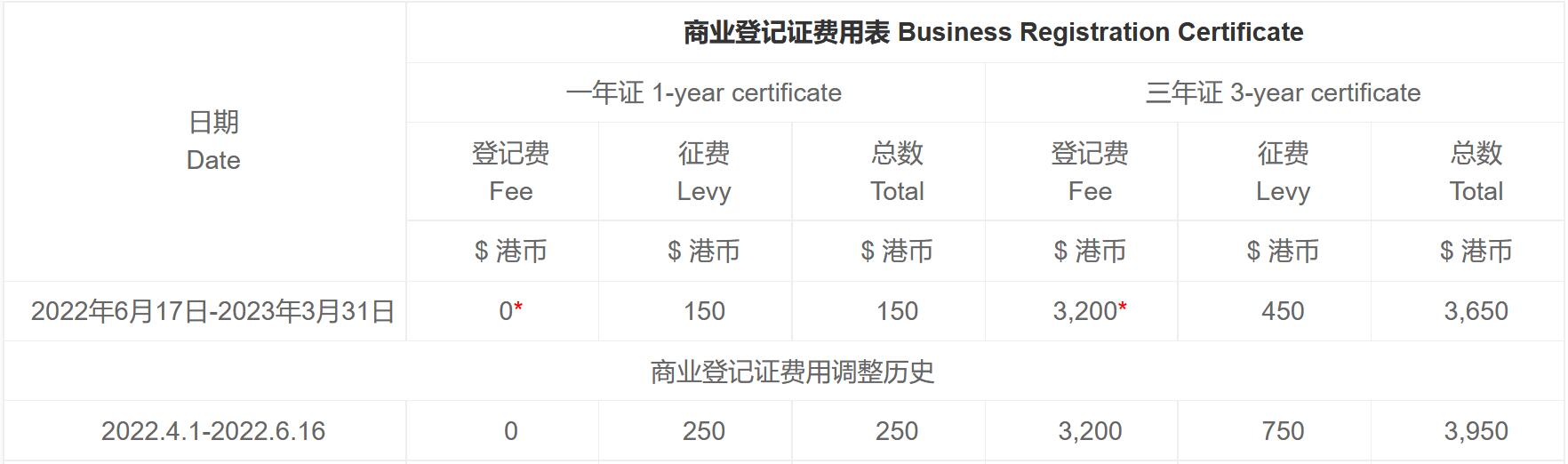 香港商業(yè)登記費不是固定的,香港政府每年都有可能調(diào)整商業(yè)登記費。最近一次調(diào)整漲價是今年4月1日,商業(yè)登記費0元恢復(fù)到原來的2000元。答