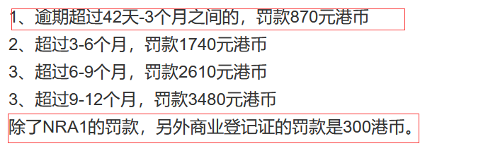 - 如在由成立為法團(tuán)的周年日翌日起計(jì)超過42天但不超過3個(gè)月,罰款870港幣;