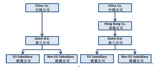 上圖為中國投資者直接從中國或間接經(jīng)由香港,通過荷蘭中間控股公司,在其他國家或地區(qū)投資的典型架構(gòu)。