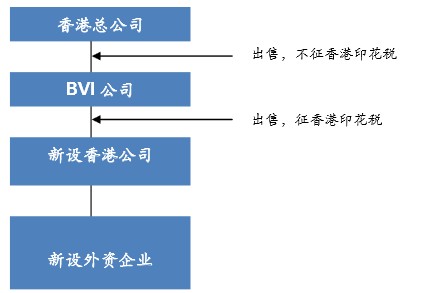 新設香港公司的目的是為方便日后土地升值時出售。其中集團曾經考慮是否加插BVI公司以免除香港印花稅,即: