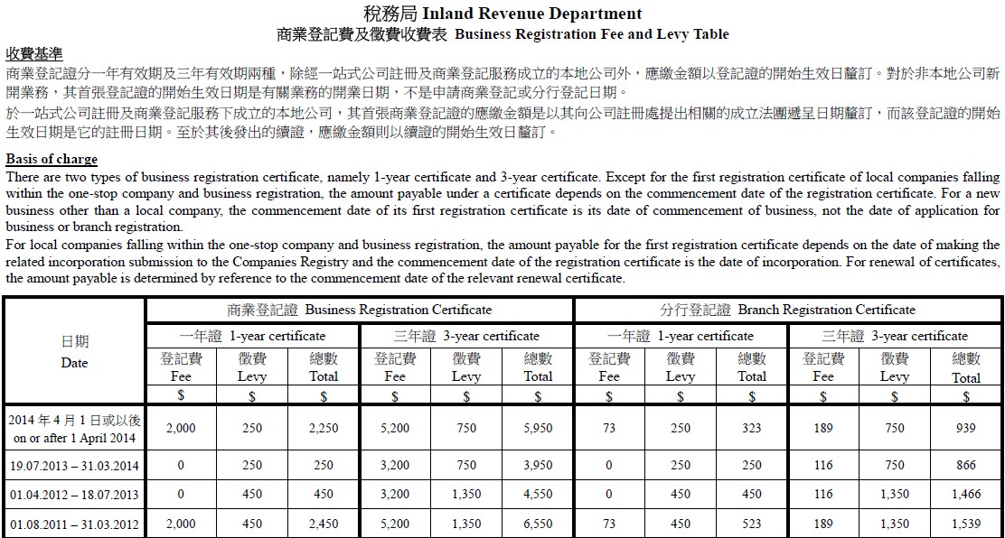 《2013 年收入(減少商業(yè)登記費)令》將于 2014年 4 月 1 日屆滿。業(yè)務(wù)經(jīng)營者須就于該日或之后1生效的商業(yè)或分行登記證繳付訂明的商業(yè)登記費或訂明的分行登記費(視屬何情況而定)和征費。就每張登記證須繳付的金額,請參閱商業(yè)登記費及征費收費表。