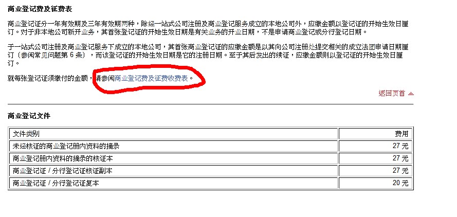 而你所查到的費用是商業(yè)登記文件的費用,其實商業(yè)登記費用及征費表也是在該頁面,就要你貼出來這個價格圖表的上方一點,有個“請參閱商業(yè)登記費及征費收費表。”,點擊該鏈接就會彈出PDF版的今年及歷年的商業(yè)登記證費用表了。