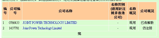 好奇就上香港注冊處網站查了一下“joint power technology co.ltd”找不到,用“joint power technology limited”查,查到有兩條記錄。