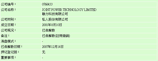 第一條注冊號為0766433 的JOINT POWER TECHNOLOGY LIMITED,上面顯示公司狀況已經是解散了。