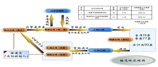 據調查,早在2009年,犯罪嫌疑人陸某就曾把其銷售到泰國、馬來西亞等地的設備以高報價方式騙取退稅,累計騙取出口退稅2600萬元。嘗到甜頭后的陸某,又指使其妻劉某在臺灣注冊成立一家離岸公司作為進口設備的境外賣方,并在香港注冊成立另一家離岸公司作為進口設備的境外賣方,構建了一個完全由陸某掌控的、以“道具機器”循環進出口騙取出口退稅的犯罪環鏈。