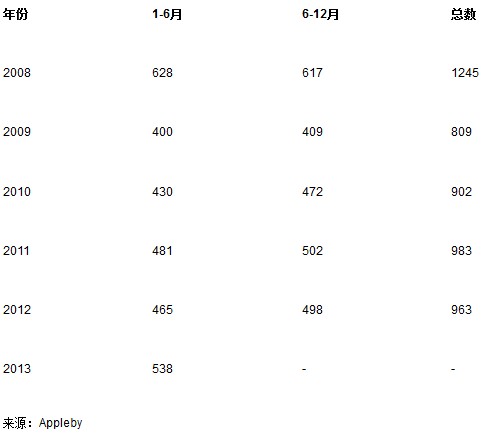 馬恩島的數(shù)據(jù)顯示了2%的下跌(474家)。雖然如此,由于該年度第一季度馬恩島由于公司注銷的關(guān)系,也使得該地區(qū)的數(shù)據(jù)的真實度打了折扣,如圖所示。事實上,該島大環(huán)境下在該年度上半年的9%的新公司注冊漲幅,我們認(rèn)為真實的情況是馬恩島在2013年的漲幅穩(wěn)定。