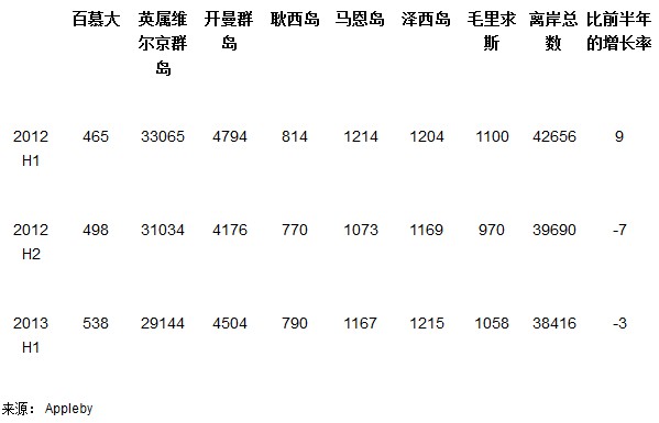 百慕大是在本地公司注冊總量增加最大的行政特區(qū),比2012年12月底的數(shù)字上升了5%。排名第二的則是毛里求斯的4%。