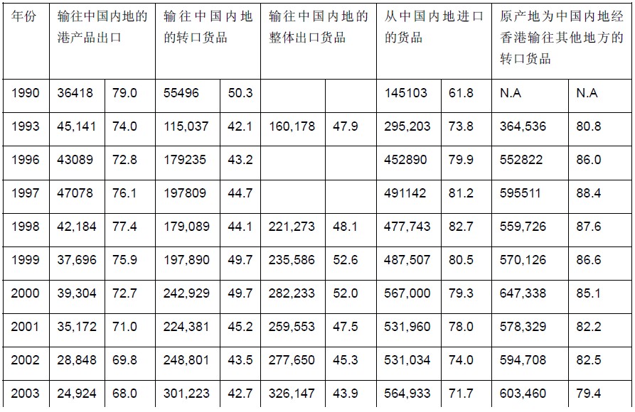香港外發加工1貿易的比率表明,輸往中國內地的轉口貨品中涉及外發加工的比重從1990年開始總體下降趨勢,除1999和2000年有一個小高峰(但仍低于1990年水平);從中國內地進口的貨品中涉及外發加工的比重從1999年開始持續下降,占來源地比例的下降說明外發內地加工產品直接付運的增加。這可從《香港貿易及貿易支援服務》的研究報告獲證,該報告表明:在受訪公司所銷售的中國產品中,絕大部分經香港轉口往海外市場,但轉口所占比例由1991年的81%下降至75%。同時,轉運和直接付運的比重則分別由11%和8%上升至13%和12%。各地經香港對內地轉口的年均增長率由八十年代的54.7%降至九十年代的25.5%,內地經港轉口年均增長率由八十年代41.9%降至23.7%(閻波,1995)。
