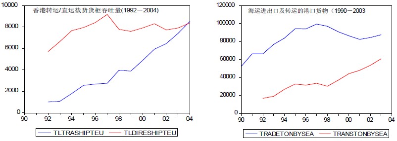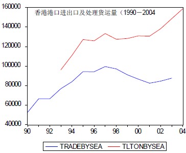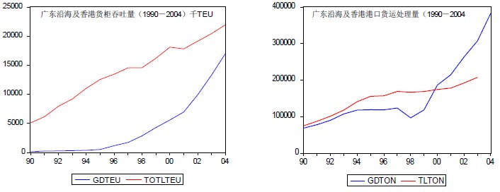 從下圖a可以發現,自2001年開始,以廣州港和深圳港為主體的廣東沿海港口所處理的貨柜吞吐量(GDTEU)呈直線上升趨勢,增長速度快于香港港口的貨柜吞吐量(TOTLTEU)。對于港口貨運處理量(圖b),1998年始,以廣州港和深圳港為主體的廣東沿海港口處理的貨運量(GDTON)的增長速度就快于香港港口,到2000年已超過香港港口貨運處理量(TLTON)。因此,可以得出結論,自2001年始,經香港港口轉運逐漸向內地港口直接付運發展。