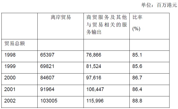 但由于香港1995年起開始采用詳細的服務貿易統計分類,1995年前沒有細分數字,為獲取更長序列的數據,本文中離岸貿易數字采用“商貿服務及其他與貿易相關的服務”代替。本文也用1998—2002年的數字作比較,發現前者占后者的比例基本穩定在85%—90%之間(見表1)。