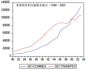 從服務貿易各組別所占比例變動看,運輸作為一種貿易支援服務,本身就是一種服務貿易,其增加值并不統計在商品貿易中,而是統計在服務貿易中。香港港口處理貨物或貨柜,這是提供了運輸服務,因此運輸服務輸出在所有服務輸出中的比例也可反映離岸貿易(特別是轉運貿易)發展的情況。數據顯示:從1995年開始,運輸服務輸出在所有服務輸出中所占比例開始持續下降,從1994年的34.6%下降至2003年的29.7%。而反映離岸貿易發展(轉運和直接付運貿易)的商貿服務及其他與貿易相關服務輸出在所有服務輸出中的比重則在1995年首次超過1980年的19.2%水平,達到19.3%,此后開始持續上升,1999年開始,上升速度也加快,到2003年達到35.9%,兩者對比反映了內地直接付運的發展。