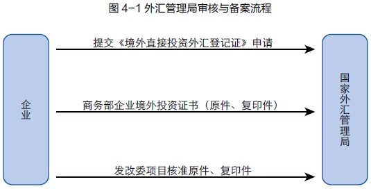 企業獲國家發改委和商務主管部門許可后憑有關文件向所在地國家外管局申請辦理境外投資外匯登記,之后直接到銀行辦理境外投資購付匯手續(圖4-1)。
