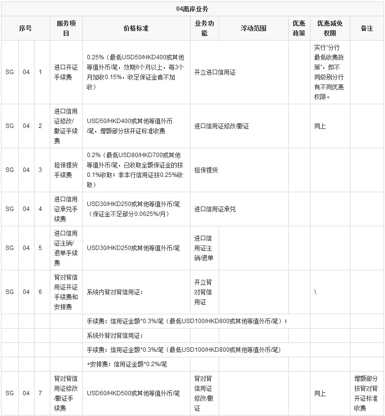 - 開立背對背信用證:系統內背對背信用證,手續費為信用證金額0.3%/筆(最低USD100/HKD800或其他等值外幣/筆);系統外背對背信用證,手續費為信用證金額0.3%/筆(最低USD100/HKD800或其他等值外幣/筆), 安排費,信用證金額*0.2%/筆。