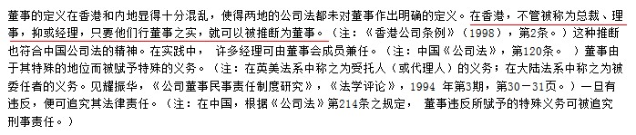 根據香港《公司條例》規定,公司董事是指包括以任何職稱擔任董事職位的人。即無論職位名稱如何變化(不管是董事長、總裁,還是總監、顧問),只要直接或間接地履行董事職責,即是公司真正的董事。