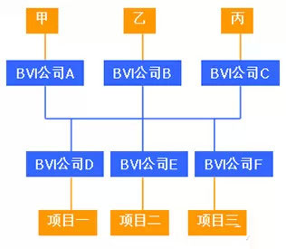甲、乙、丙三人的海外投資結構需要合理優化,借助離岸平臺的優化結果見下圖。首先,由甲、乙、丙三人各自持有一間BVI公司,分別為A、B、C,從而確保投資者信息的不透明性,三人的信息將完全被保密,保證原始投資信息的安全,并且將原本屬于甲、乙、丙三人的共同投資行為從投資人信息上進行分離和隱藏,獲得投資者非關聯化的效果。其次,A、B、C三間BVI公司共同持有一間BVI公司D,D公司投資海外項目一;A、B、C三間BVI公司共同持有一間BVI公司E,E公司投資海外項目二;A、B、C三間BVI公司共同持有一間BVI公司F,F公司投資海外項目三。由于D、E、F都是BVI公司,依然利用其不透明性保證了投資方的信息安全。最后,用D、E、F三間BVI公司分別持有三個海外項目,達到了風險分散的目的。