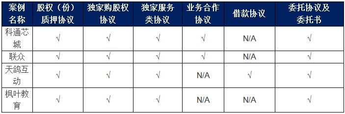 《業務合作協議》的主要內容為確保WFOE對OPCO內部制度和人員的控制條款,以及OPCO的一系列不作為承諾(主要包括不得從事與過往經營不一致的業務活動,不得擅自進行重大重組、收購或投資,不得擅自融資貸款或對外提供擔保等)。在部分案例中該等內容可能被整合于獨家服務類協議中(如楓葉教育),但也有部分案例單獨另行簽署此類協議(如科通芯城和聯眾);