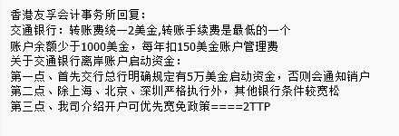 關于交通銀行離岸賬戶手續費這要看你是發生了什么業務,如是網銀轉賬那須10美元/筆,匯款單20美元,如果日均少于1000美元,年費150美元。如果還有不明白,可以咨詢開戶行客戶經理。答