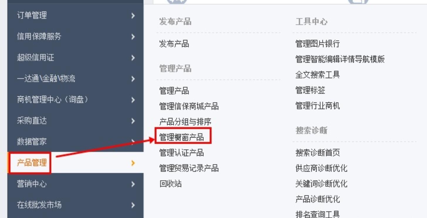 入口一:My Alibaba后臺-產(chǎn)品管理-管理櫥窗產(chǎn)品。