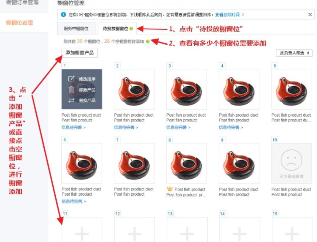 進(jìn)入“櫥窗位設(shè)置”頁面,點(diǎn)擊“待投放櫥窗位”,查看有多少個櫥窗位需要添加,按提示數(shù)量準(zhǔn)確添加;點(diǎn)擊添加櫥窗產(chǎn)品,或直接點(diǎn)擊空櫥窗位進(jìn)行櫥窗產(chǎn)品添加,上線順序從前往后。
