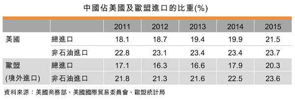 在美國和歐盟全球兩大進口市場,中國所占的比重也在上升。據(jù)美國統(tǒng)計,中國占美國進口的比重從2011年的18.1%擴大到2015年的21.5%(若扣除石油進口,同期所占比重從22.8%上升至23.7%)。據(jù)歐盟統(tǒng)計,中國占歐盟境外進口的比重從2011年的17.1%上升到2015年的20.3%(若扣除石油進口,同期所占比重從21.8%上升到23.6%)。中國在日本進口總額所占的比重也從2011年的21.5%上升到2015年的24.8%。