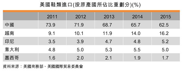 鞋類方面,中國仍占美國進口的大部分,不過所占比重已從2011年的73.9%下降到62.5%。歐盟境外進口鞋類方面,中國所占的比重從2011年的50.5%下降到2015年的46.3%。此外,越南及印尼均是美國及歐盟主要的進口鞋類供應國。