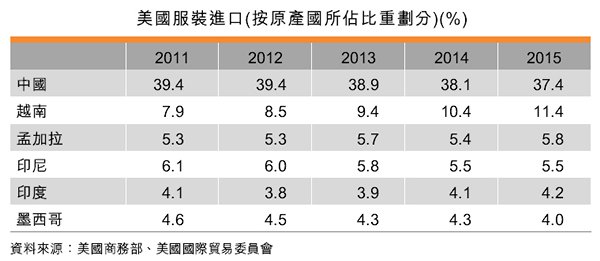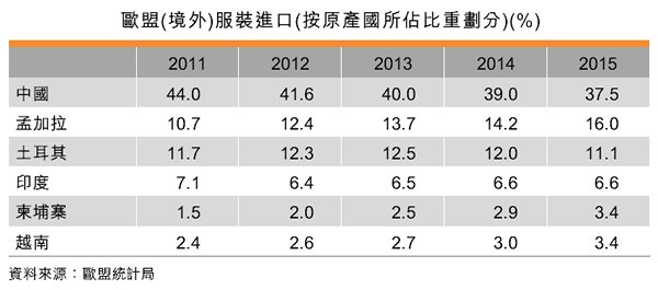 從中國在全球出口市場所占的比重可見中國整體出口仍保持競爭力。不過,部分生產(chǎn)活動從中國分散至其它生產(chǎn)基地,特別是亞洲其他經(jīng)濟體,難免影響中國勞動密集型或較低增值產(chǎn)品在海外市場所占的比重。服裝方面,中國占美國進口的比重由2011年的39.4%降至2015年的37.4%,而越南則是新晉的供應國。歐盟進口服裝方面,中國所占的市場比重也從2011年的44%下降到2015年的37.5%。