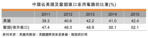 表:中國占美國及歐盟進口家用電器的比重(%)