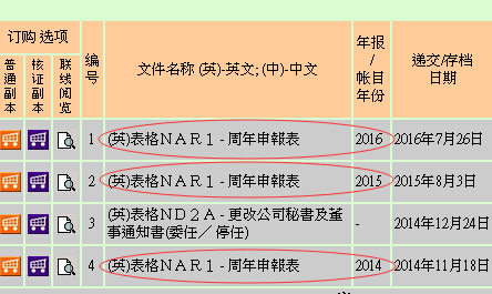進去選[查閱文件索引],可以選[公司編號]、[公司英文全名]或[公司中文全名],中文要繁體字,這樣進去就可以查詢到香港公司基本資料了,要查更多信息,點下面的[進入文件索引],選擇相應的存檔年份,再點[跳至],進入這里,你香港公司有沒有年審就可以看里面出來了,如今天遞交的年審,會顯示最新的 表格 NAR1 周年申報表,遞交/存檔日期:2016年9月5日。如今年已經到期年審,但缺少今年的記錄,說明不正常了。 以上內容參考 by @qixing