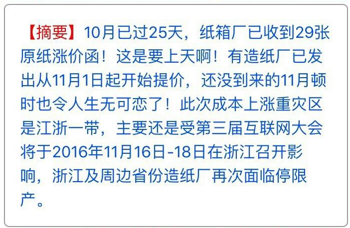 再回到2016年的這場漲價(jià)風(fēng)波,看來有了上次經(jīng)驗(yàn),浙江紙箱廠大多已從容應(yīng)對,紛紛抱團(tuán)發(fā)出漲價(jià)函,除此之外,再結(jié)合市場其他形勢,小編總結(jié)出如下較為全面的分析:
