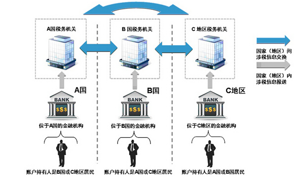 根據(jù)“標(biāo)準(zhǔn)”開展金融賬戶涉稅信息自動交換,首先由一國(地區(qū))金融機(jī)構(gòu)通過盡職調(diào)查程序識別另一國(地區(qū))稅收居民個人和企業(yè)在該機(jī)構(gòu)開立的賬戶,按年向金融機(jī)構(gòu)所在國(地區(qū))主管部門報送上述賬戶的名稱、納稅人識別號、地址、賬號、余額、利息、股息以及出售金融資產(chǎn)的收入等信息,再由該國(地區(qū))稅務(wù)主管當(dāng)局與賬戶持有人的居民國稅務(wù)主管當(dāng)局開展信息交換,最終實現(xiàn)各國(地區(qū))對跨境稅源的有效監(jiān)管。具體過程如下圖所示: