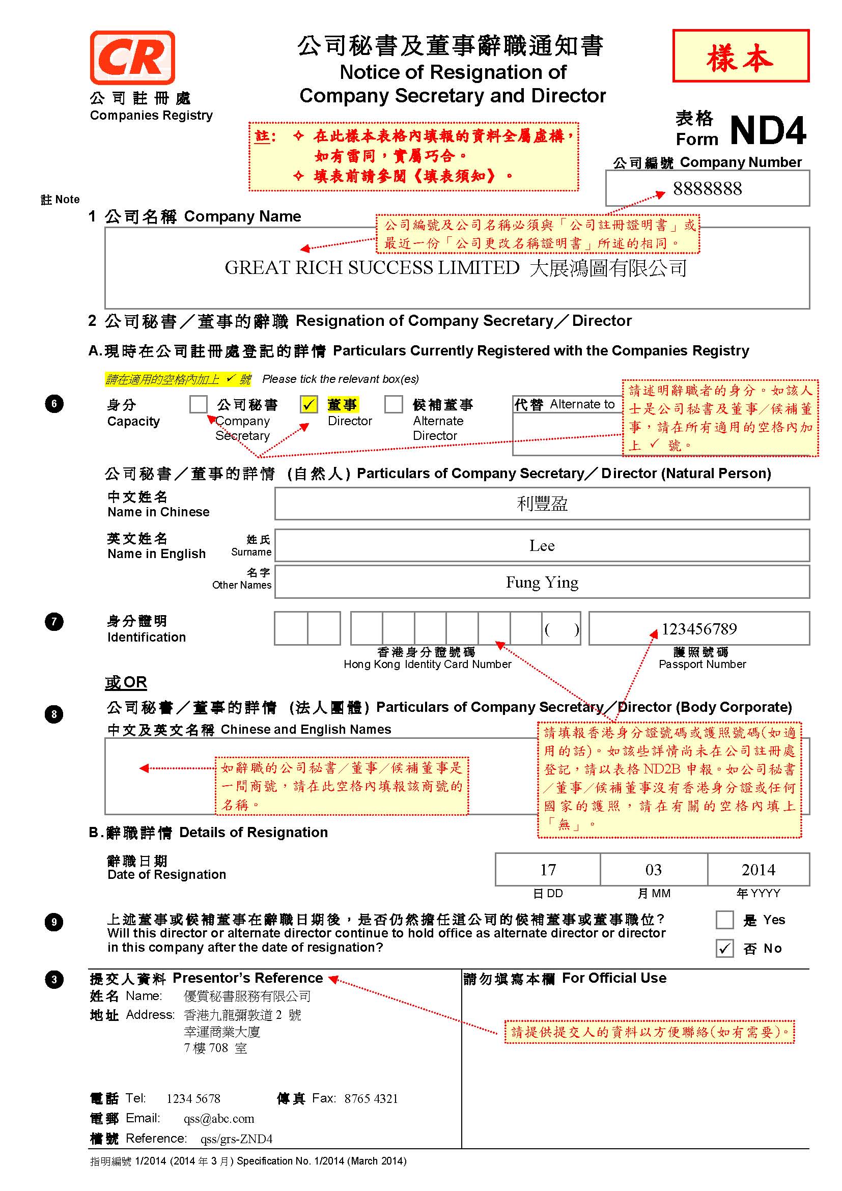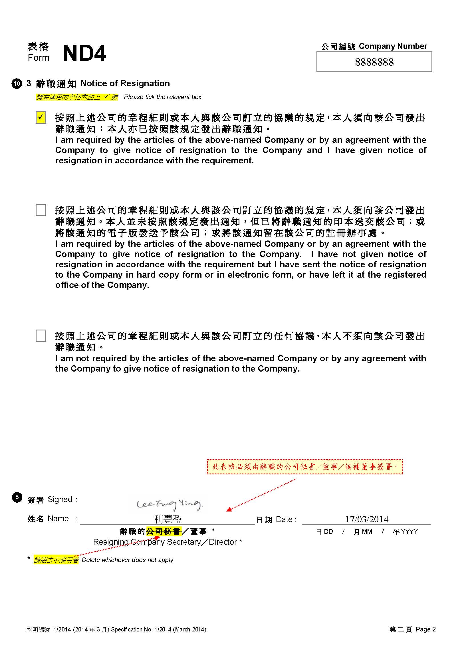 1.(a)辭職的公司秘書或董事(包括候補(bǔ)董事但不包括備任董事)如有合理理由相信公司將不會就其辭職一事以表格ND2A通知公司注冊處