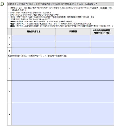 D.第四部份 – 稅務居民所在地及相關稅務編號或具有等同功能的識辨編號(以下簡稱「稅務編號」)