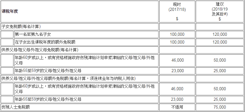 財政司司長建議由2018/19課稅年度起提高下列免稅額,并設立傷殘人士免稅額:提高長者住宿照顧開支的可扣除上限