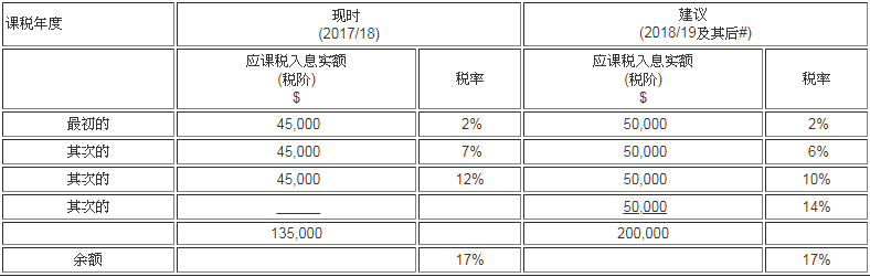 財政司司長建議由2018/19課稅年度起將稅階由45,000元擴闊至50,000元,并由四個稅階增至五個,邊際稅率分別調整為百分之二、六、十、十四及十七。現時及建議的稅階及邊際稅率可參看下表: